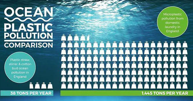 Indeed, you can see below that the amount of ocean pollution from plastic straws, stirrers and cotton buds pales in comparison to the plastic pollution caused by simply washing our clothes.