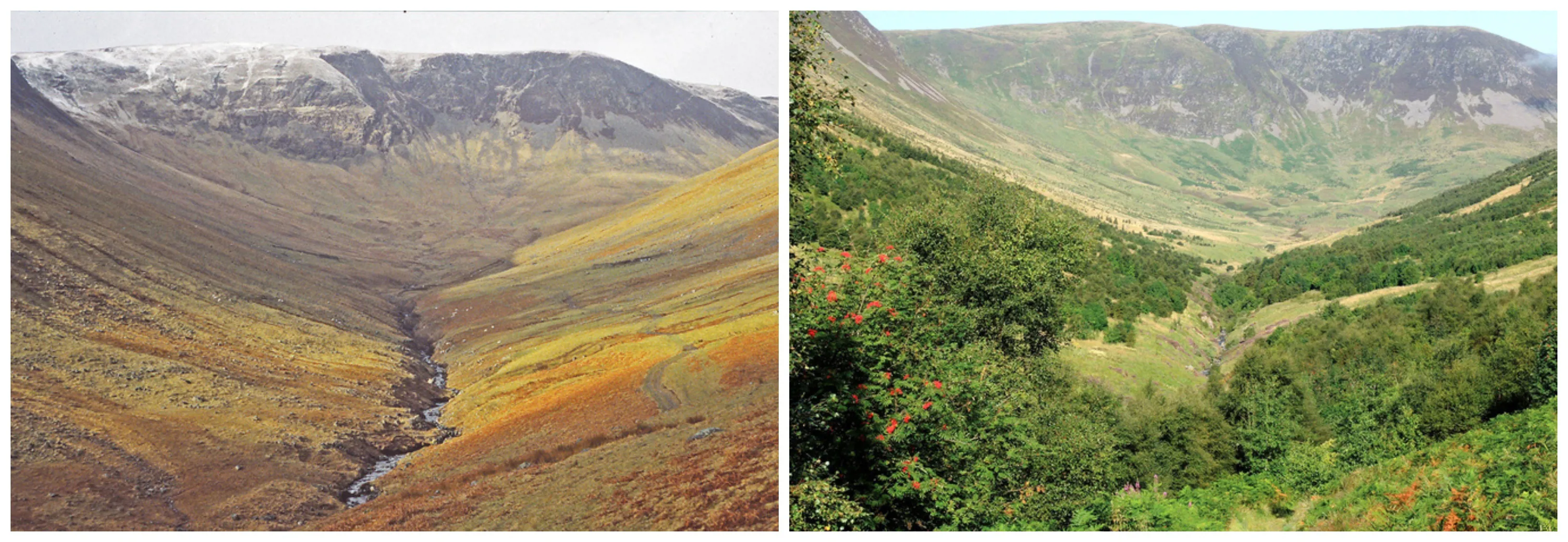 Carrifran Valley in the Scottish Borders, part of the Borders Forest Trust Rewilding initiative. These images show how bare hills can transform into flourishing woodland of colour and rich bird song when rewilding is facilitated. Photos by John Savory/Borders Forest Trust